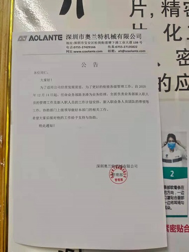 深圳市奧蘭特機(jī)械有限公司人事變動