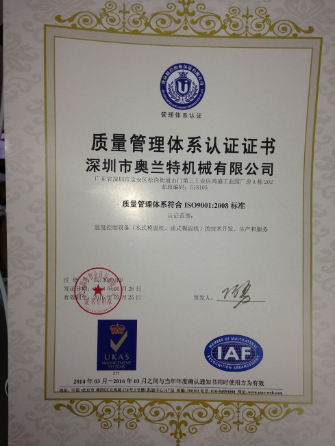 深圳奧蘭特機械經過全體員工的不懈努力,于2013年3月26日獲得由北京聯合智業認證有限公司頒發的質量管理體系認證證書,奧蘭特機械管理體系符合ISO9001:2008標準,認證范圍(水式模溫機、油式模溫機)的技術開發、生產和服務。有效期至2016年3月25日。證書的頒發是對奧蘭特機械全體員工工作的認可,奧蘭特機械將以管理體系ISO9001:2008的標準進行生產和管理,并不斷的改進。