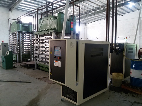 橡膠硫化一般都是平板控溫或由平板傳熱到模具控溫,橡膠硫化機是采用油溫機、電加熱導熱油爐給模板加熱控溫,模板再把熱量傳給模具,一般使用在橡膠硫化、無紡布定型、玻璃鋼成型、碳纖維成型等行業。