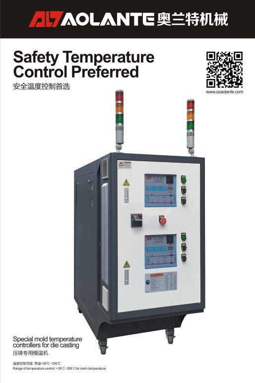 壓鑄油溫機普遍叫做壓鑄模溫機,是以導熱油為媒介的模溫機。導熱油在模具內的管道不斷流動進行熱交換,將模具均勻加熱達到使用溫度。采用導熱油還有一個好處是溫度控制精度高,由于壓鑄模溫機本身帶有冷卻系統,所以可以將導熱油油溫準確地控制在設定范圍。這樣就可以控制模具的溫度也在極小的誤差范圍內,即便是生產中斷也可以保持適當的模具溫度。導熱油還有一個非常明顯的優勢就是使用高,壓鑄油溫機最高使用溫度可以達到400℃,使用的范圍非常廣,如果以水為媒介使用溫度只有180℃。